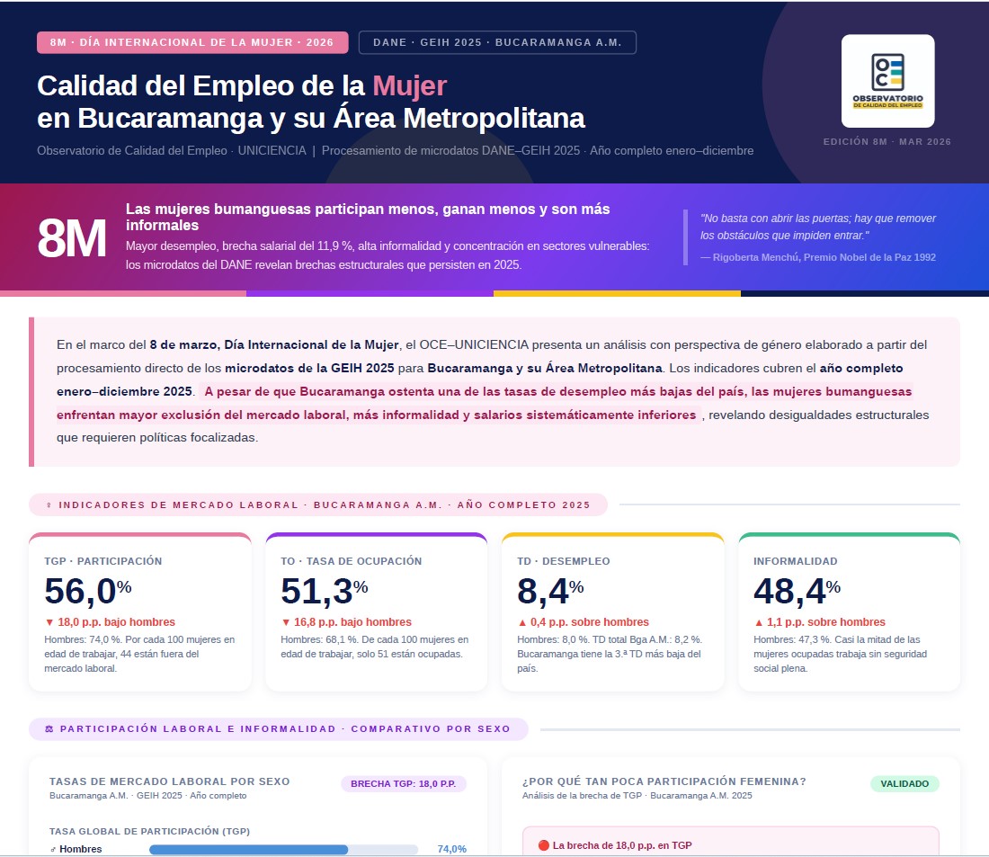 El Observatorio de Calidad del Empleo de UNICIENCIA es una iniciativa con visión académica, de incidencia en política pública y de utilidad empresarial, para el monitoreo, análisis e investigación aplicada de las condiciones laborales en Colombia desde una perspectiva multidimensional, crítica e innovadora. Su propósito es proveer información y análisis periódicos, territorialmente desagregados y socialmente útiles, basados en fuentes oficiales, que sirva para la formulación de políticas públicas, decisiones empresariales responsables y acciones ciudadanas informadas. A través de una plataforma interactiva y de informes técnicos especializados, el Observatorio aborda el análisis de la calidad del empleo desde distintas perspectivas: el trabajo decente, el desarrollo humano, el desarrollo sostenible, las desigualdades del mundo del trabajo y las nuevas transformaciones laborales. El Observatorio tiene una vocación nacional, con especial énfasis en las ciudades donde UNICIENCIA tiene presencia institucional: Bucaramanga, Bogotá y Tunja, entre otras.